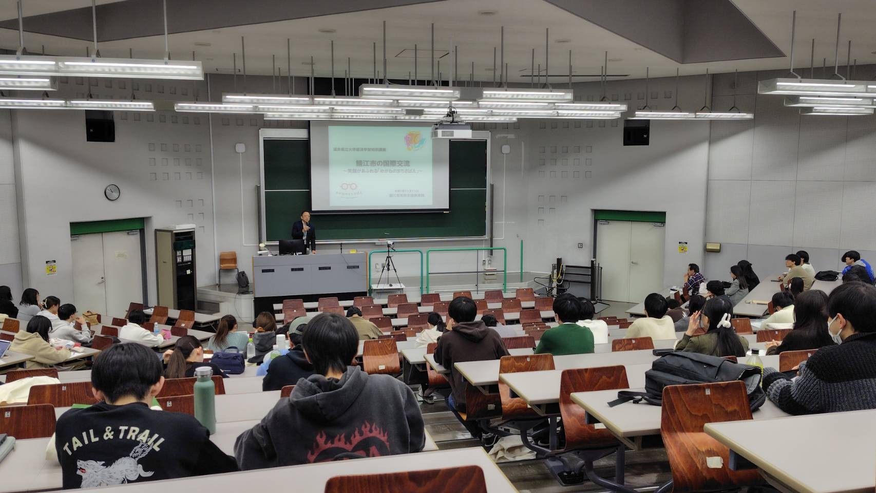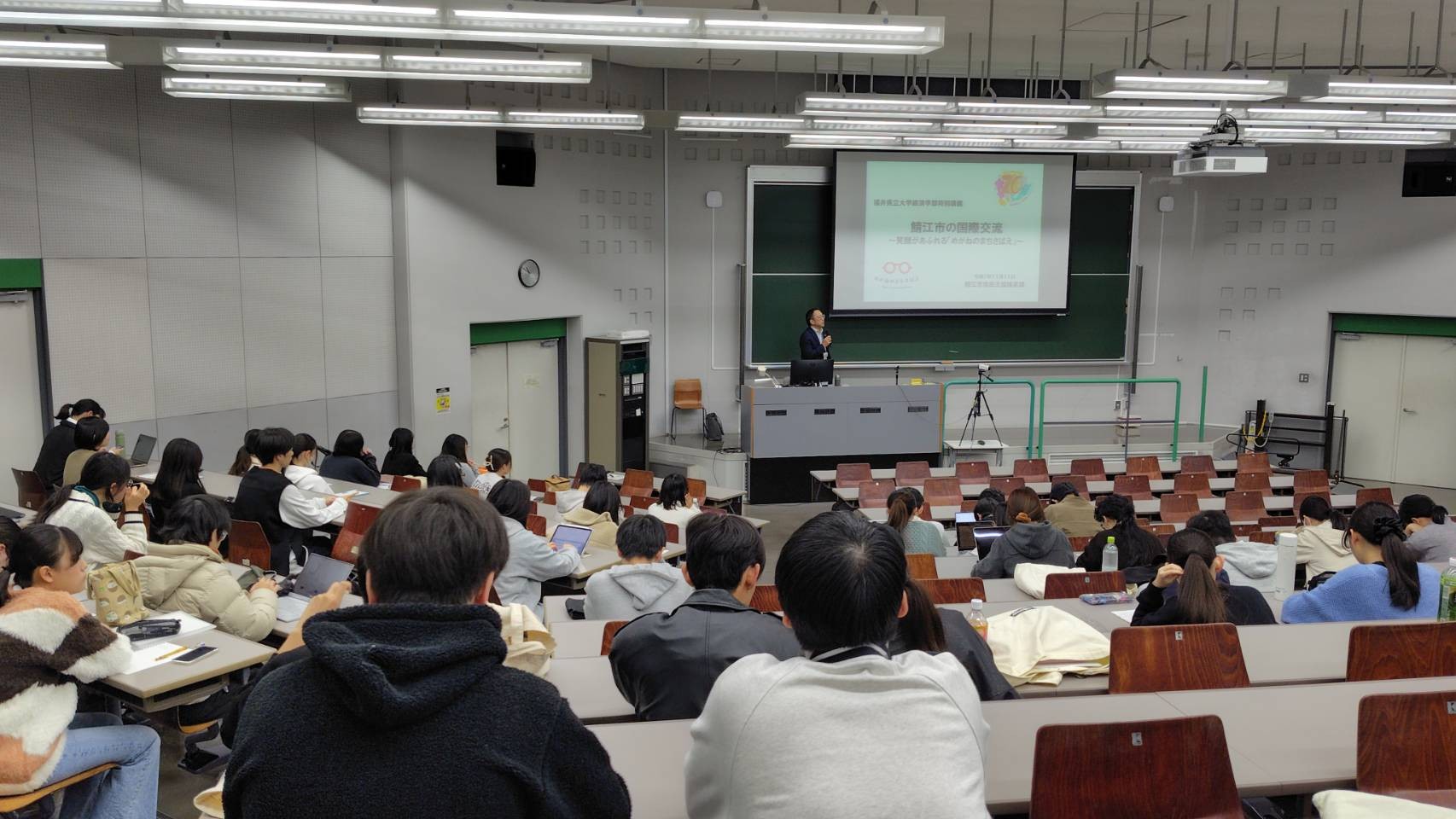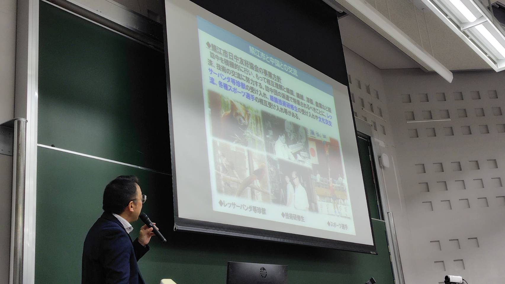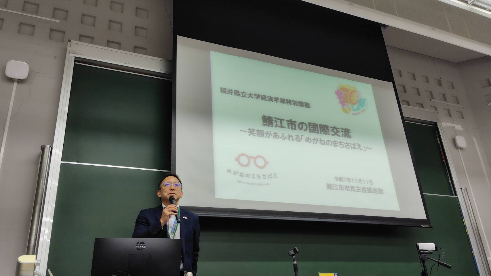 講義では、地域の視点から国際関係を考えるというコンセプトのもと、鯖江市と中国をはじめとした国際交流の状況や、鯖江市に住む外国人に向けた政策、多文化共生の取り組みのほか、課題についてもお話しいただきました。