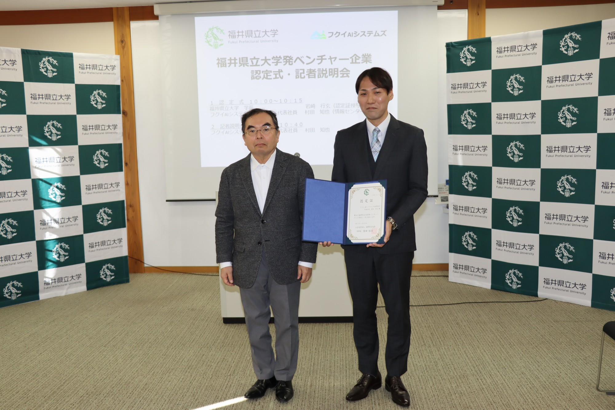 認定式では、本学の岩崎学長が村田代表に対して大学発ベンチャー企業であることを認定する認定証を授与し、「フクイAIシステムズ合同会社の事業が、地域社会のデジタル化や活性化に貢献することを期待したい 」と挨拶しました。これに対し、村田代表は「導入が簡単でセキュリティ性の高いAIを提供し、地域に貢献したい 」と意欲を語りました。
