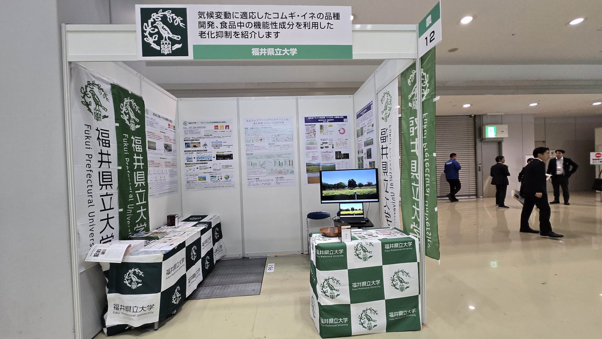 ブースでは、洪水に強いイネやドローンによる全自動種まき技術、除草剤を使わないリビングマルチ対応コムギ「LM12」、福井県ブランド小麦「ふくこむぎ」を使ったパンの試食、老化物質“AGEs”の抑制研究など、生物資源学部の多様な研究を展示しました。特に「ふくこむぎ」のパン試食は好評で、各研究内容に関する具体的な技術相談も多数寄せられました。また、松井孝憲准教授による特別セミナーも開催し、参加者から高い関心が寄せられました。