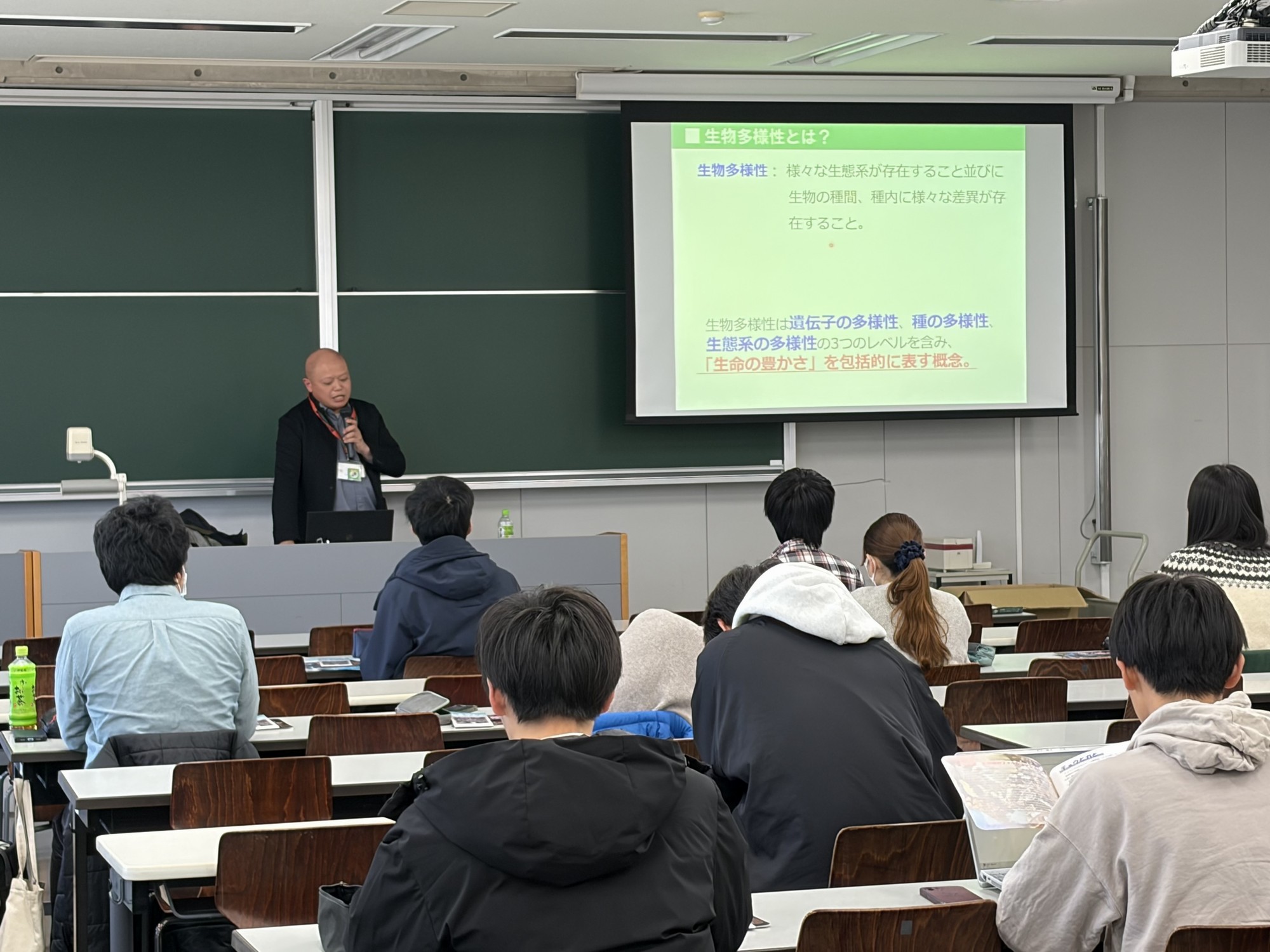 特別講義は12月4日、11日、18日の3週にわたって行われ、受講生58名が参加しました。第1回では、博物館の役割や研究員(学芸員)の仕事、梅村氏ご自身のキャリア形成、博物館の道を選んだ経緯などについて、現場の視点から具体的に紹介されました。第2回では、昆虫の生態に関する基本的な考え方や、昆虫が示す多様な生活史・行動など、身近な例を交えた解説が行われました。第3回では、昆虫における絶滅危惧種の特定方法や保護の考え方、調査・記録の重要性など、地域の生物多様性保全に直結する内容が取り上げられました。